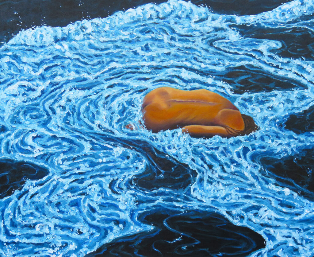 Het Pruisisch blauw mengt zich met een tikje gebrande omber en wit tot een licht grijs-blauw-groen en ik denk: “Ja, inderdaad, zo voelde die blues.” Sinds een tijdje werk ik weer aan een nieuwe serie schilderijen met als titel ‘Kings of Heart’. Over 5 mannen die ik gekend heb en die een spoor in mijn hart hebben achtergelaten. Positief en negatief, zoals een litteken mooi kan zijn. Dat wat ik in deze serie schilderijen wil verbeelden gaat niet zozeer over die mannen of over het verhaal van de relatie die ik met hen had, maar over het gevoel dat het me gaf. En het gevoel dat het me nu geeft als ik eraan terug denk. De vorm van het litteken zeg maar, waar mijn hart onverstoorbaar omheen en doorheen klopt.